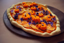 Halloween themed pizza with miniature pumpkins as pizza toppings.